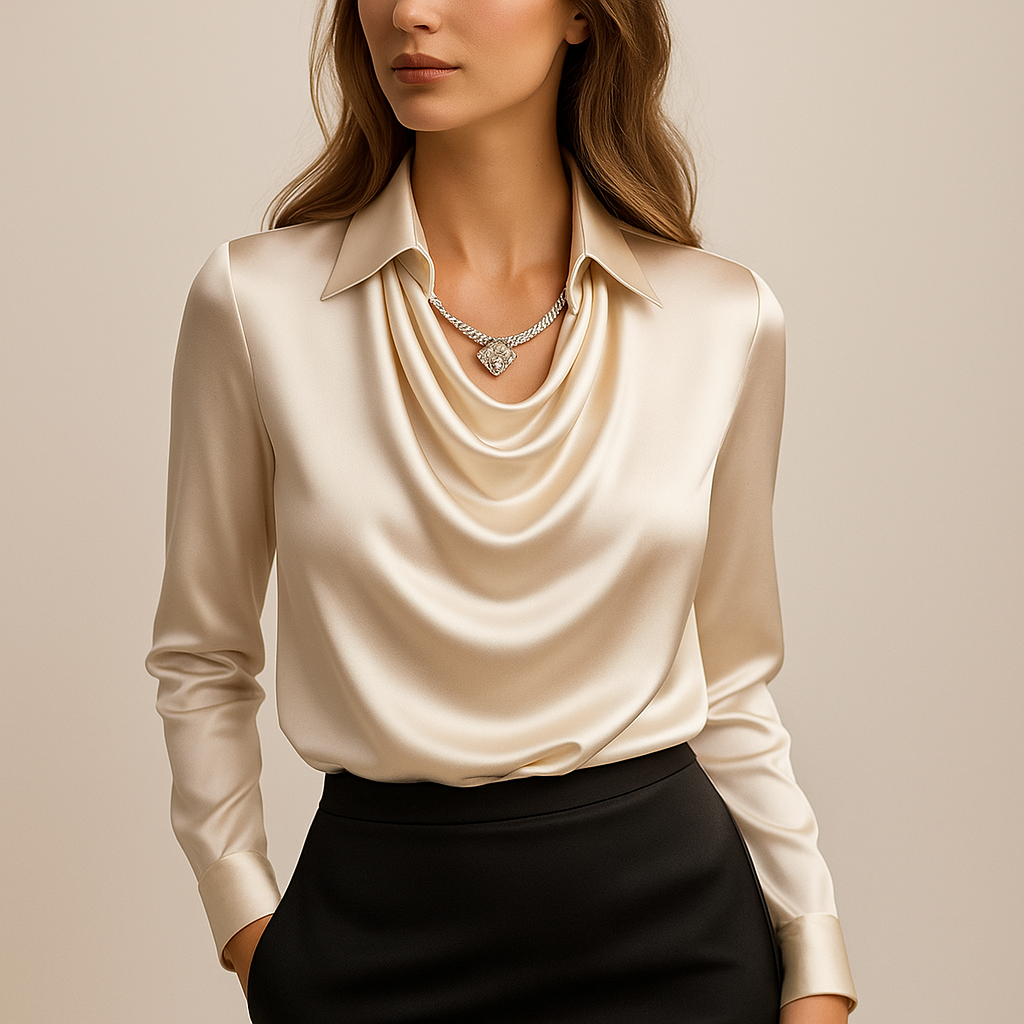 Den subtila satängglansen och den mjuka vattenfallskragen skapar en tidlös, feminin look.